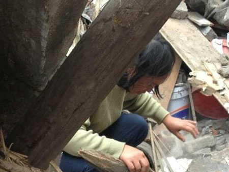 The woman pictured tried to rescue her son, who was trapped in the washroom when the deadly earthquake happened. The son begged her to leave him alone as he saw the rest of the house was beginning to collapse. However, the mother finally managed to move away a slab weighing over 50 kilograms by herself to save her son. She said she did not know where her strength came from.