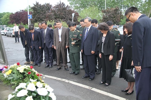 Chinese ambassador to Serbia Zhang Wanxue (4th R, first row) shows his respect for three Chinese journalists killed in the U.S.-led NATO bombing of the Chinese embassy in Belgrade in front of a monument in Belgrade, capital of Serbia, on May 7, 2013. Shao Yunhuan of Xinhua News Agency along with Xu Xinghu and his wife Zhu Ying from the Beijing-based Guangming Daily newspaper were killed in the missile attack which inflicted serious damage to the embassy buildings on the evening of May 7, 1999. (Xinhua/Wang Hui)