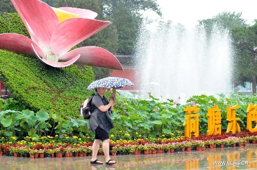 Tourists view lotus flowers in drizzle at Yuanmingyuan, the Old Summer Palace, in Beijing, capital of China, July 10, 2013. Photo: Xinhua
