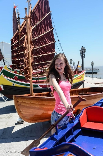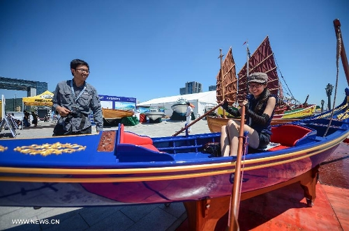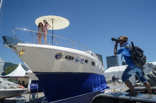A model poses for photos during the 2013 China (Zhoushan archipelago) International Boat Show in the Putuo District of Zhoushan City, East China's Zhejiang Province, July 11, 2013. The show kicked off on Thursday. Photo: Xinhua