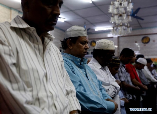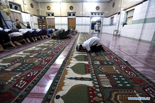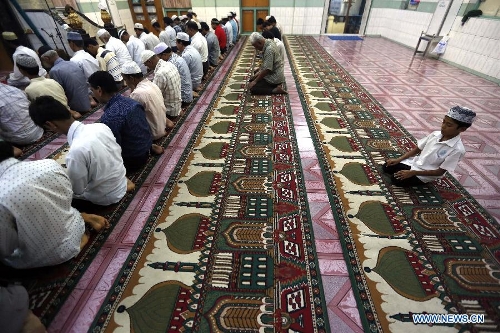 Muslims pray at a mosque during the holy month of Ramadan in Yangon, Myanmar, on July 13, 2013. Muslims throughout the world are celebrating the holy fasting month of Ramadan. (Xinhua/U Aung)