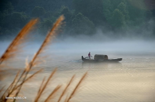 A fisherman fishes on the Xiaodongjiang River in Zixing City, Central China's Hunan Province, July 7, 2013. (Xinhua/He Maofeng)