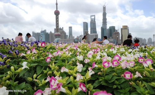 Visitors enjoy themselves at the Bund in East China's Shanghai Municipality, July 13, 2013. The Air Quality Index released by Shanghai Environmental Monitoring Center Saturday morning was 42, a level suitable for outdoor activities, which attracted many people to go outside and enjoy themselves. (Xinhua/Lai Xinlin)