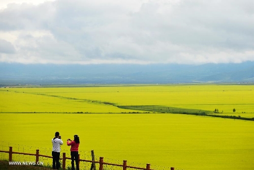 Two visitors take pictures of rape flowers in Menyuan Hui Autonomous County, Northwest China's Qinghai Province, on July 9, 2013. More than 500,000 mu (about 33,000 hectares) of rape flowers blossomed since July and attracted many tourists there. (Xinhua/Wu Gang)