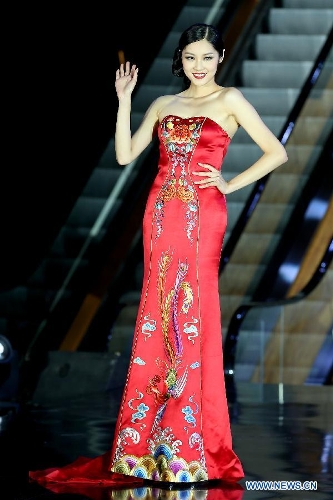 Winner of the contest, Lei Shuhan from China, presents a creation during the 8th Asia Super Model Contest in Nanning, capital of south China's Guangxi Zhuang Autonomous Region, July 14, 2013. Contestants from China, Russia and South Korea won the top 3 of the contest. Photo: Xinhua