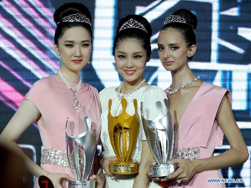 The top 3 of the 8th Asia Super Model Contest attend the awarding ceremony in Nanning, capital of south China's Guangxi Zhuang Autonomous Region, July 14, 2013. Contestants from China, Russia and South Korea won the top 3 of the contest. Photo: Xinhua