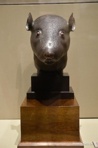 A bronze head of a rat is on display at the National Museum of China in Beijing, capital of China, July 18, 2013. The bronze heads of a rat and a rabbit, donated by the Pinault family of France in April, were on display at the museum Thursday. The two pieces of relics were among 12 animal head sculptures that formed a zodiac water clock previously stood at Yuanmingyuan, or the Old Summer Palace, in northwest Beijing. They were looted by Anglo-French Allied forces during the Second Opium War in 1860. Photo: Xinhua