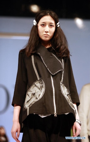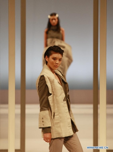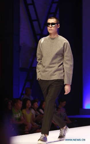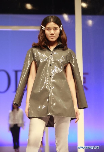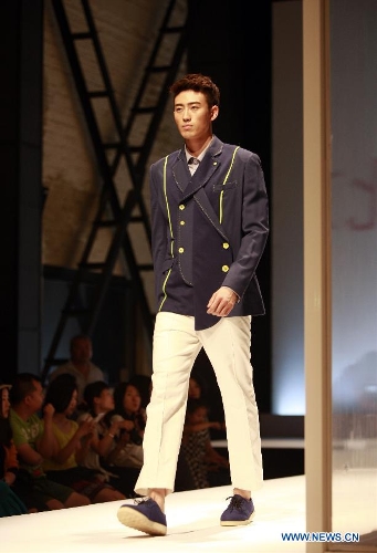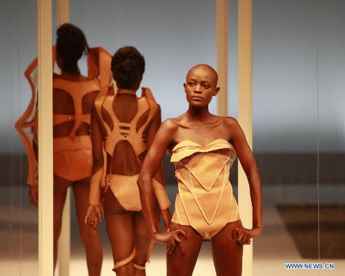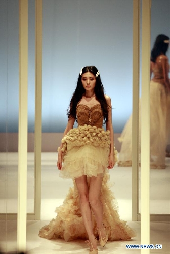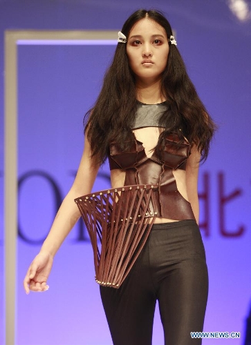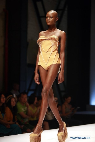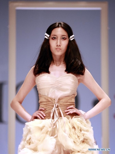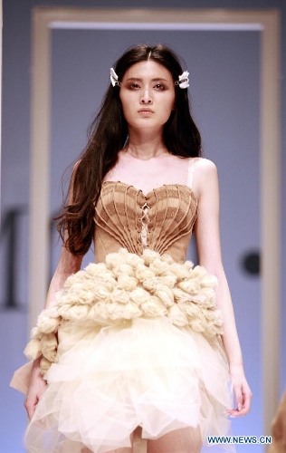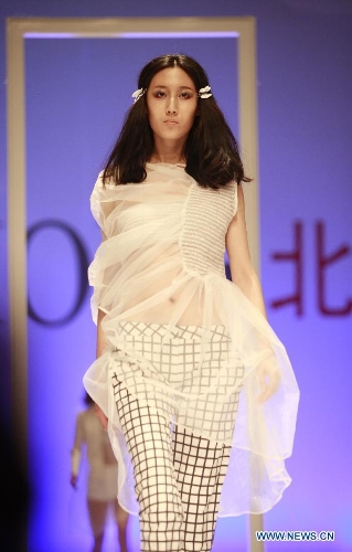 A model presents a creation during a fashion event showcasing works by graduates of the ESMOD Beijing, an international fashion institute, in Beijing, China, July 18, 2013. (Xinhua/Hou Dongtao)
