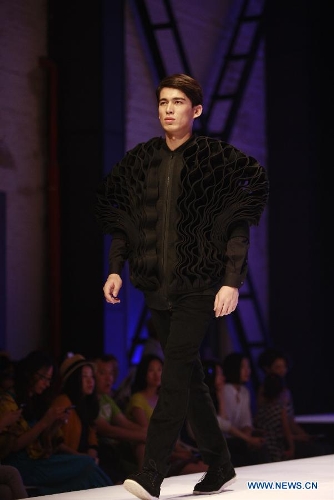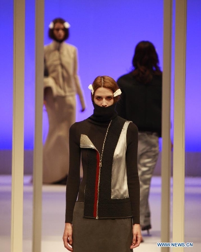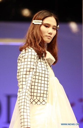 A model presents a creation during a fashion event showcasing works by graduates of the ESMOD (L'Ecole Superieure des Arts et Techniques de la Mode) Beijing, an international fashion institute, in Beijing, China, July 18, 2013. (Xinhua/Hou Dongtao)