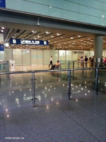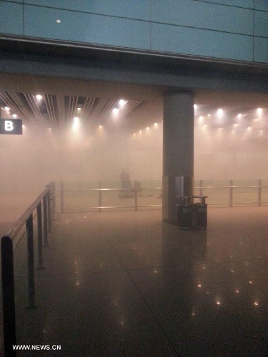 Photo taken on July 20, 2013 with a cellphone shows the site of an explosion at Terminal 3 of the Beijing Capital International Airport in Beijing, capital of China.