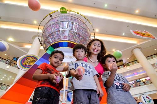 Three children shows capsules from a capsule vending machine which sets a Guinness World Record for the world's largest one, at a shopping mall in Kuala Lumpur, capital of Malaysia, on July 20, 2013. The machine which can contain 125,000 capsules will be used here for four months. (Xinhua/Chong Voon Chung)