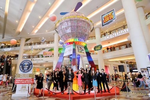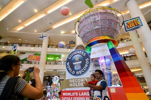 Visitors pose for photos by a capsule vending machine which sets a Guinness World Record for the world's largest one, at a shopping mall in Kuala Lumpur, capital of Malaysia, on July 20, 2013. The machine which can contain 125,000 capsules will be used here for four months. (Xinhua/Chong Voon Chung)