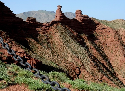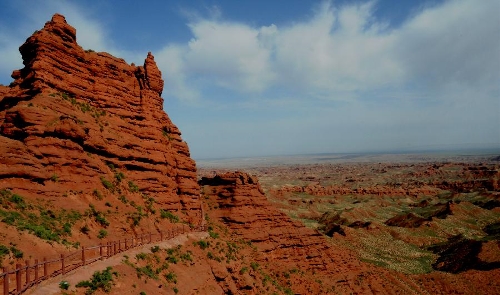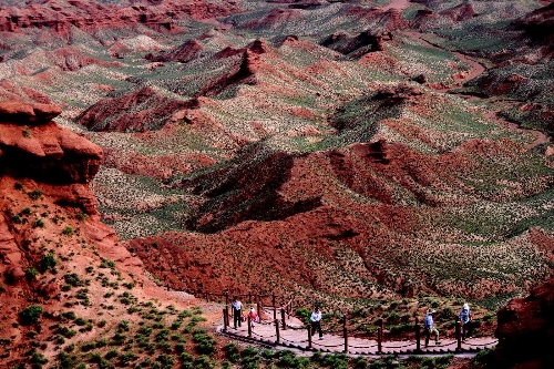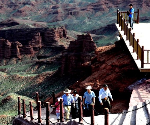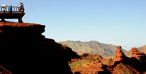 Visitors view the scenery of Danxia landform at Pingshan Lake scenic area in Zhangye, Northwest China's Gansu Province, July 20, 2013. Danxia, which means "rosy cloud", is a special landform formed from reddish sandstone that has been eroded over time into a series of mountains surrounded by curvaceous cliffs and many unusual rock formations. (Xinhua/Wang Jiang)