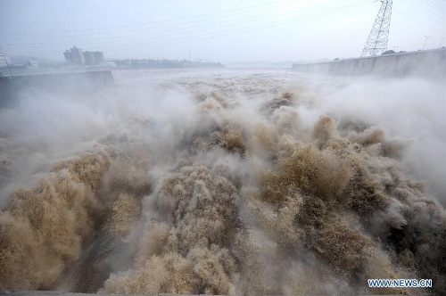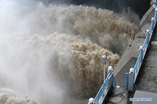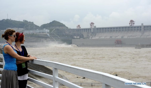Visitors watche flood water discharged from the Three Gorges Dam, a gigantic hydropower project on the Yangtze River, central China's Hubei Province. The Yangtze River, China's longest, braced for its largest flood peak so far this year due to continuous rainfall upstream. Water flow into the reservoir of the Three Gorges Dam reached 49,000 cubic meters per second on Sunday morning. (Xinhua/Lei Yong)