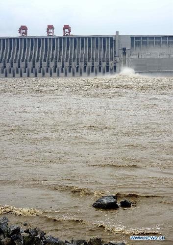 Photo taken on July 21, 2013 shows the Three Gorges Dam, a gigantic hydropower project on the Yangtze River, central China's Hubei Province. The Yangtze River, China's longest, braced for its largest flood peak so far this year due to continuous rainfall upstream. Water flow into the reservoir of the Three Gorges Dam reached 49,000 cubic meters per second on Sunday morning. (Xinhua/Lei Yong)
