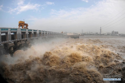 Flood water is discharged from the Gezhou Dam in Yichang City, central China's Hubei Province, July 21, 2013. The Yangtze River, China's longest, braced for its largest flood peak so far this year due to continuous rainfall upstream. Water flow into the reservoir of the Three Gorges Dam reached 49,000 cubic meters per second on Sunday morning. (Xinhua/Xiao Jiafa)