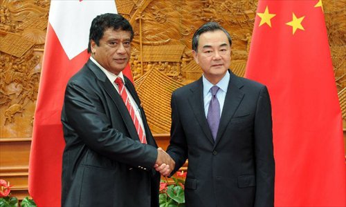Chinese Foreign Minister Wang Yi (R) meets with Tongan Prime Minister Siale'ataonga Tu'ivakano in Beijing, capital of China, July 23, 2013. Photo: Xinhua