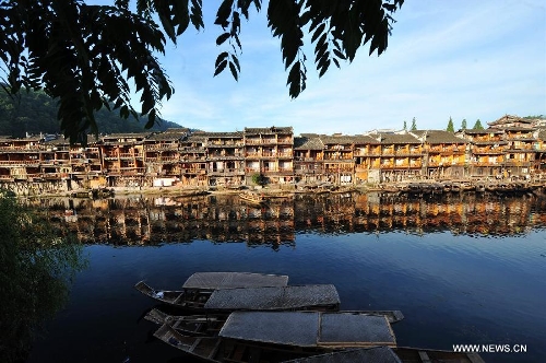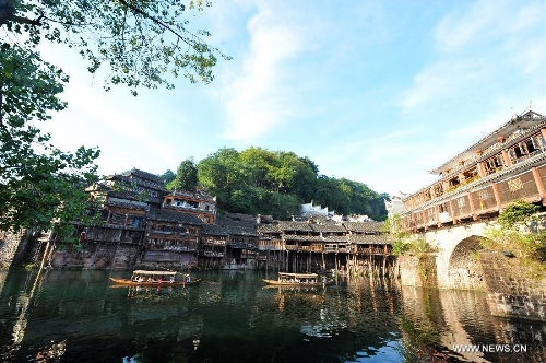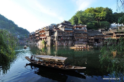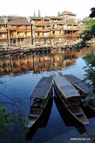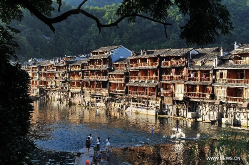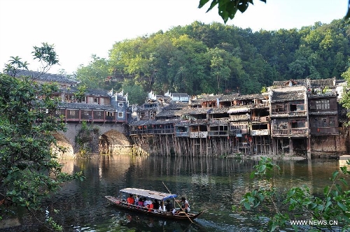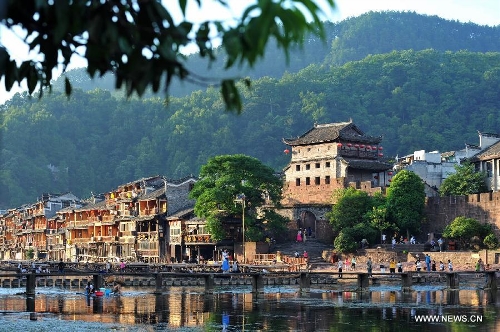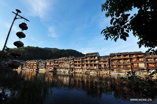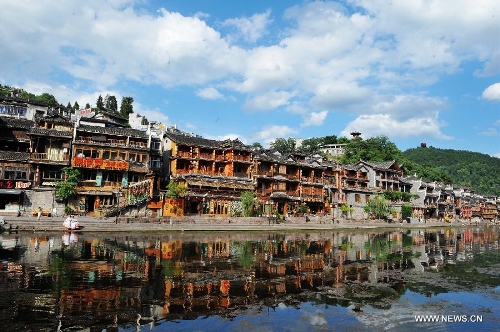 Photo taken on July 23, 2013 shows the scenery in the ancient town of Fenghuang in Fenghuang County of Xiangxi Tu and Miao Autonomous Prefecture, central China's Hunan Province. The tourist resort witnessed a travel peak in July, attracting 417,400 visitors till July 22, increasing by 28.79 percent year on year. (Xinhua/Long Hongtao)