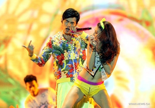 Singer Jay Chou (L) performs at his "Opus Jay 2013 World Tour" Tianjin concert in Tianjin, north China, July 27, 2013. (Xinhua/Ma Cheng)