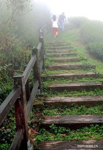 Tourists walk on a plank road at Xiding in the Alishan scenic area in Chiayi, southeast China's Taiwan, July 29, 2013. Xiding is one of the best places to view mist and sunrise in the scenic area. (Xinhua/Tao Ming)