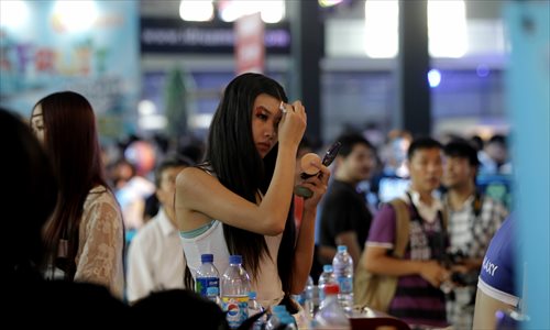 A booth model fixes her makeup at the 2013 ChinaJoy gaming conference on July 25, 2013 in Shanghai. The young woman explained she was still feeling under the weather after coming down with a cold two days before. Photo: Yang Hui/GT