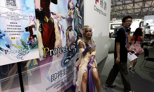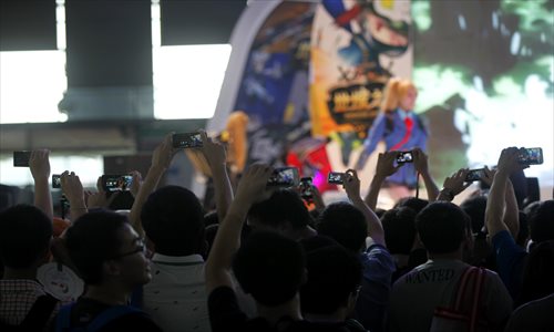 Visitors at 2013 ChinaJoy take photos of a cosplay model on a stage at a gaming company booth on July 25 in Shanghai. Photo: Yang Hui/GT