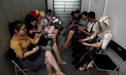 A cosplay model takes a smartphone break at the 2013 ChinaJoy exhibition in Shanghai on July 25. Photo: Yang Hui/GT