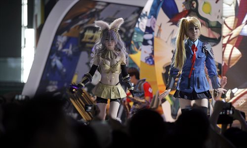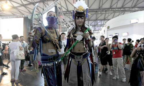 Two cosplay models pose for photos during the 2013 ChinaJoy gaming conference in Shanghai on July 25. According to Sina Tech, cosplay models earned up to 1500 yuan ($245) a day, half of which go to talent agency fees. Photo: Yang Hui/GT