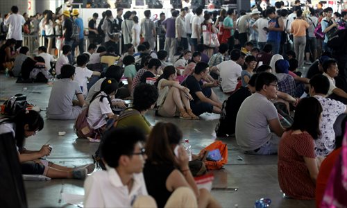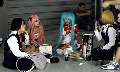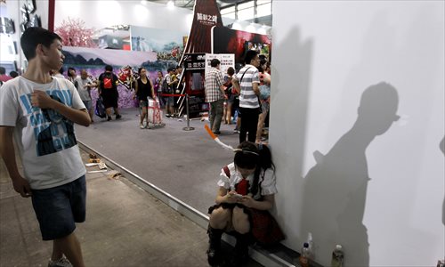 Visitors sit on the floor of the 2013 ChinaJoy exhibition area on July 25 in Shanghai. According to official estimates, over 200,000 people attended the four-day event, which ended on July 28. Photo: Yang Hui/GT