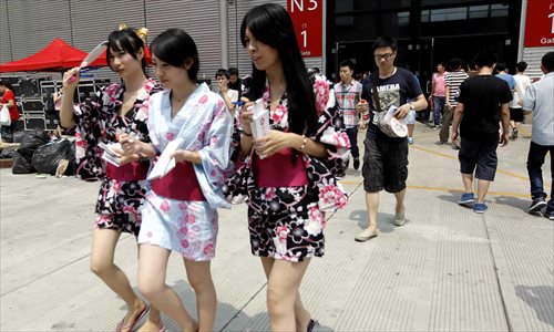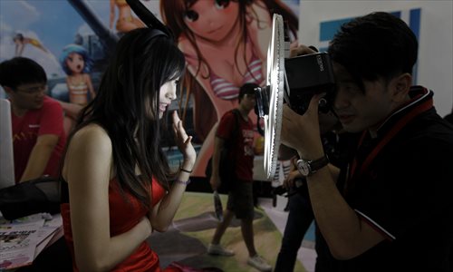A 2013 ChinaJoy visitor enjoys the view during a performance at a booth on July 25 in Shanghai. A reported total 200,000 people attended the 2013 China Digital Entertainment Expo and Conference, known as ChinaJoy, the majority of which were male. Photo: Yang Hui/GT