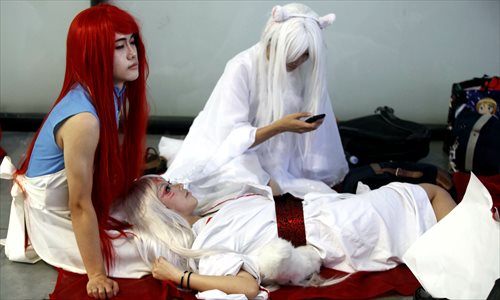A cosplay model surnamed Gu, a student from a Shanghai-area college, rests after suffering from mild sunstroke while working the 2013 ChinaJoy gaming conference on July 25 in Shanghai. Gu, like most cosplay models at the four-day conference, wore heavy wigs and costumes as outside temperatures reached 40 C. Photo: Yang Hui/GT