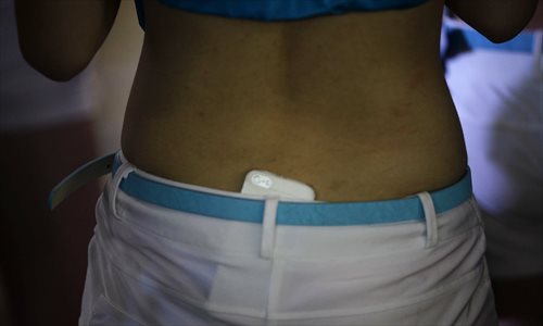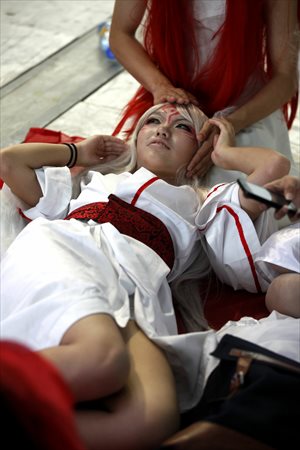 A cosplay model surnamed Gu (pictured laying down), a student from a Shanghai college, recovers from mild sunstroke as fellow models accompany her at the 2013 ChinaJoy gaming expo in Shanghai on July 25. Gu, like most cosplay models at the four-day conference, wore heavy wigs and costumes as outside temperatures reached 40 degrees Celsius. Most models worked at least from 9 am to 4:30 pm daily. Photo: Yang Hui/GT