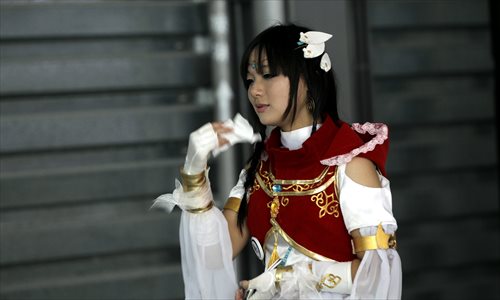 A cosplayer sits at a booth at the 2013 ChinaJoy gaming conference on July 25 in Shanghai. Models at the 11th annual China Digital Entertainment Expo and Conference, known as ChinaJoy, were on their feet from 9 am to 4:30 pm during the four-day conference. Photo: Yang Hui/GT
