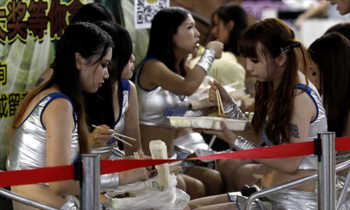A group of models at the 2013 ChinaJoy gaming expo grab a box lunch break between performances on July 25 in Shanghai. Photo: Yang Hui/GT