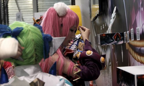 A cosplay model freshens her makeup while on stage during the 2013 ChinaJoy gaming convention July 25 in Shanghai. Photo: Yang Hui/GT
