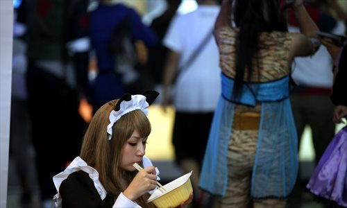 A cosplay model has a quick lunch break while working the 2013 ChinaJoy gaming conference at the Shanghai New International Expo Centre on July 25. Photo: Yang Hui/GT