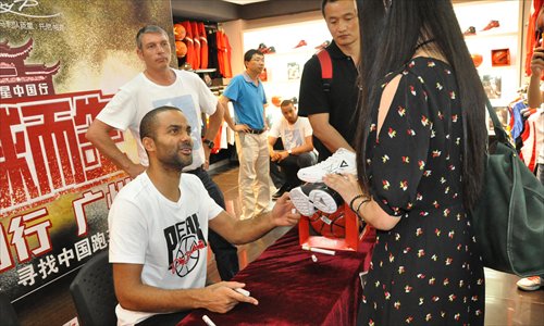 NBA star Tony Parker signs shoes for fans on July 5 at Chengdu University of Technology, Sichuan Province. Parker led an entourage of more than 20 NBA stars to nine cities during their Peak China tour. Photo: Courtesy of Peak