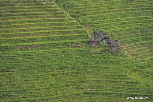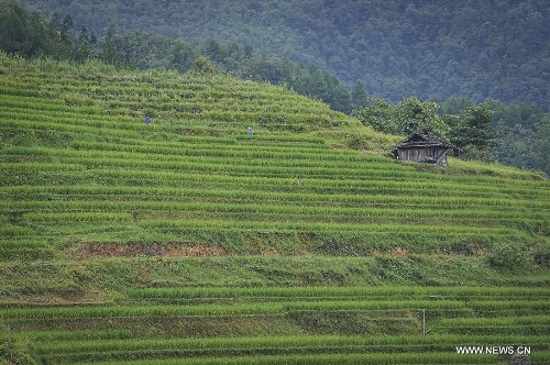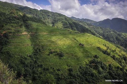 Photo taken on August 4, 2013 shows the terraced fields in Jihua township of Rongjiang county, Southwest China's Guizhou Province. Due to the lack of arable land, local residents reclaimed the mountain slopes and cultivated in these terraced fields. The terraced fields, which seem like jade belts winding the mountains, so is called "belt terraced fields". (Xinhua/Ou Dongqu)