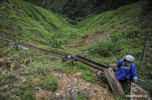 A woman of the Miao nationality draws water at the terraced fields in Jihua Township of Rongjiang County, southwest China's Guizhou Province, Aug. 4, 2013. Due to the lack of arable land, local residents reclaimed the mountain slopes and cultivated in these terraced fields. The terraced fields, which seem like jade belts winding the mountains, so is called "belt terraced fields". (Xinhua/Ou Dongqu)