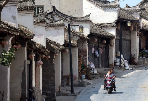 Locals ride on a street in the ancient town of Jingziguan in Xichuan County, central China's Henan Province, Aug. 4, 2013. As a former local trade center located on old trade routes, the town boasts more than 700 well-preserved ancient buildings dating back to the Ming Dynasty (1368-1644) and the Qing Dynasty (1644-1911). (Xinhua/Wang Song)
