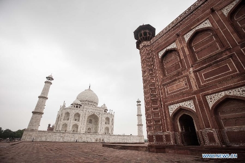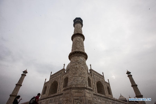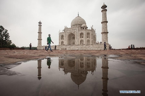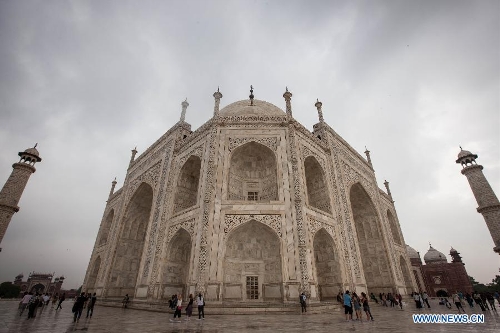 Photo taken on June 16, 2013 shows the Taj Mahal in Agra, Uttar Pradesh, India. The Taj Mahal was described by Rabindranath Tagore as "a teardrop on the cheek of time", by British writer Rudyard Kipling as "the embodiment of all things pure", and by its creator, Mughal Emperor Shah Jahan as "making the sun and the moon shed tears from their eyes". Every year, tourists come from across the world to Agra to catch a glimpse and listen to the stories of what is considered as the most beautiful building in the world. The Taj Mahal was built during the reign of Shah Jahan to commemorate his wife Mumtaz Mahal, who died in 1631. The death of Shah Jahan's beloved wife made him so heartbroken that his hair was said to turn snow white overnight. The construction of the whole complex of the Taj Mahal lasted for 22 years, with the work of some 20,000 laborers and artists from India, Persia and Central Asia. An immense mausoleum of white marble, the Taj Mahal is the jewel of Muslim art in India and one of the universally admired masterpieces. It was enlisted as the World Heritage by the United Nations Educational, Scientific and Cultural Organization in 1983. (Xinhua/Zheng Huansong)