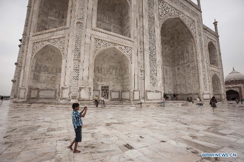 People visit the Taj Mahal in Agra, Uttar Pradesh, India, June 16, 2013. The Taj Mahal was described by Rabindranath Tagore as "a teardrop on the cheek of time", by British writer Rudyard Kipling as "the embodiment of all things pure", and by its creator, Mughal Emperor Shah Jahan as "making the sun and the moon shed tears from their eyes". Every year, tourists come from across the world to Agra to catch a glimpse and listen to the stories of what is considered as the most beautiful building in the world. The Taj Mahal was built during the reign of Shah Jahan to commemorate his wife Mumtaz Mahal, who died in 1631. The death of Shah Jahan's beloved wife made him so heartbroken that his hair was said to turn snow white overnight. The construction of the whole complex of the Taj Mahal lasted for 22 years, with the work of some 20,000 laborers and artists from India, Persia and Central Asia. An immense mausoleum of white marble, the Taj Mahal is the jewel of Muslim art in India and one of the universally admired masterpieces. It was enlisted as the World Heritage by the United Nations Educational, Scientific and Cultural Organization in 1983. (Xinhua/Zheng Huansong)