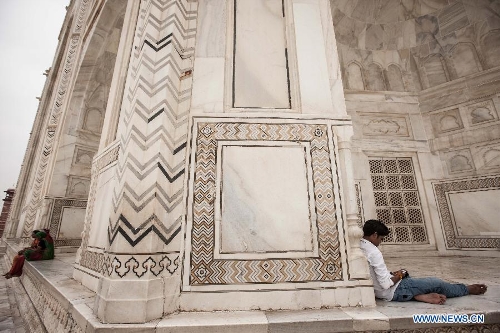 People rest at the Taj Mahal in Agra, Uttar Pradesh, India, June 16, 2013. The Taj Mahal was described by Rabindranath Tagore as "a teardrop on the cheek of time", by British writer Rudyard Kipling as "the embodiment of all things pure", and by its creator, Mughal Emperor Shah Jahan as "making the sun and the moon shed tears from their eyes". Every year, tourists come from across the world to Agra to catch a glimpse and listen to the stories of what is considered as the most beautiful building in the world. The Taj Mahal was built during the reign of Shah Jahan to commemorate his wife Mumtaz Mahal, who died in 1631. The death of Shah Jahan's beloved wife made him so heartbroken that his hair was said to turn snow white overnight. The construction of the whole complex of the Taj Mahal lasted for 22 years, with the work of some 20,000 laborers and artists from India, Persia and Central Asia. An immense mausoleum of white marble, the Taj Mahal is the jewel of Muslim art in India and one of the universally admired masterpieces. It was enlisted as the World Heritage by the United Nations Educational, Scientific and Cultural Organization in 1983. (Xinhua/Zheng Huansong)