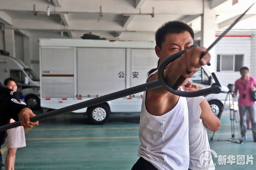 SWAT police officers train how to disarm an attacker using newly-introduced restraint devices in Foshan, South China's Guangdong Province on August 5. The device, known as a "thrust fork" or "police fork", employs a catch-type mechanism that enables police to immobilize an attacker from a safe distance. The devices were introduced after a recent spike in reported knife attacks nationwide. (Source:CFP)