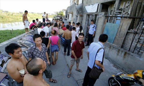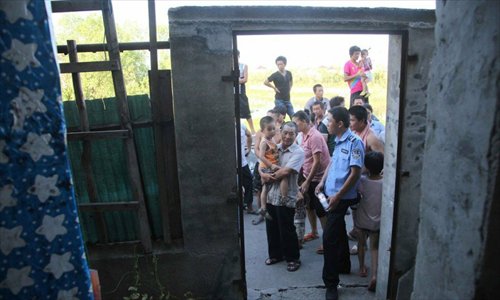 A policeman and some neighbors stand outside the house where Chen had kept Guo restrained for 11 days in a makeshift basement.