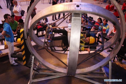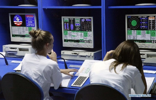 Two high school students experience in a simulator of former American space shuttle STS Endeavor in the Euro Space Center in Luxembourg Province, some 130 kilometers southeast of Brussels, capital of Belgium, August 8, 2013. Opened in 1991, the Euro Space Center becomes a hot educational spot that enable visitors to explore the outer space through multimedia presentation and experiential practice. (Xinhua/Wang Xiaojun)