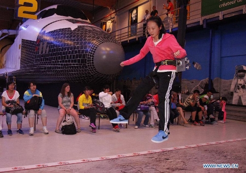 A Chinese high-school student experience how human walks on the moon in the Euro Space Center in Luxembourg Province, some 130 kilometers southeast of Brussels, capital of Belgium, August 8, 2013. Opened in 1991, the Euro Space Center becomes a hot educational spot that enable visitors to explore the outer space through multimedia presentation and experiential practice. (Xinhua/Wang Xiaojun)