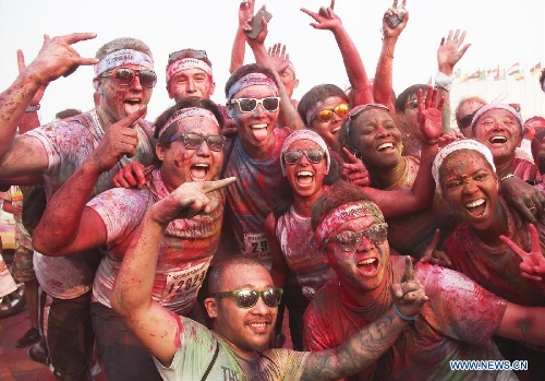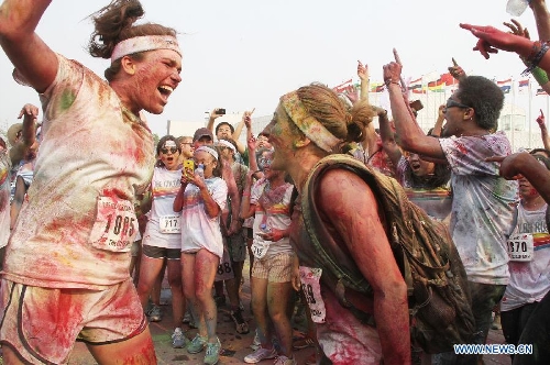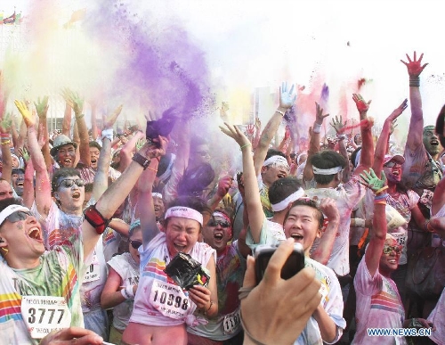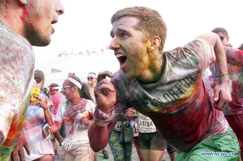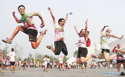 People jubilate at a color run event in Beijing, capital of China, Aug. 10, 2013. Color run is an untimed event with no winners or prizes, and runners are showered with colored powder at stations along the race. (Xinhua/Li Hui)