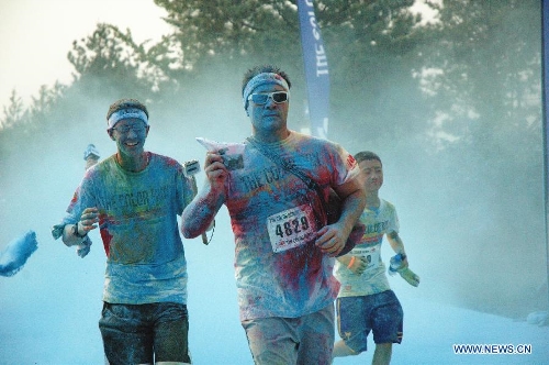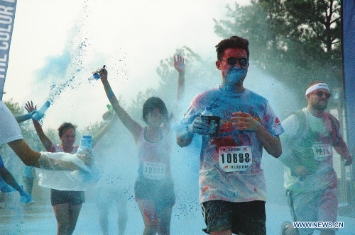 People participate in a color run event despite the sizzling weather in Beijing, capital of China, Aug. 10, 2013. Color run is an untimed event with no winners or prizes, and runners are showered with colored powder at stations along the race. (Xinhua/Li Hui)