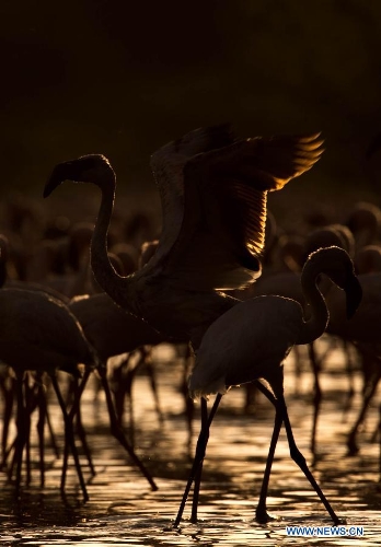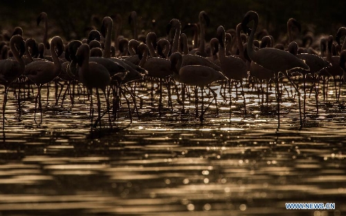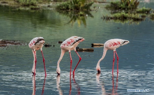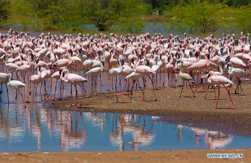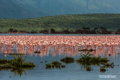 Flamingos gather in the lake Bogoria in Kenya's Rift Valley Province which is a little north of the equator, Aug. 10, 2013. Every year Flamingos in Kenya migrate between lake Nakuru, lake Naivasha and lake Bogoria to find abundant cyanobacteria to feed on. (Xinhua/Zhang Chen)